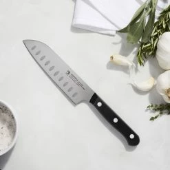 The Solution 5.5-inch santoku is a Japanese- style knife ideal for meat, fish, and vegetables. More compact than the 7-inch santoku, this knife is ideal for smaller tasks. Itβs the ideal knife for practicing the βpush cutβ technique in which the knife is held stable and pushed down into the cutting board.