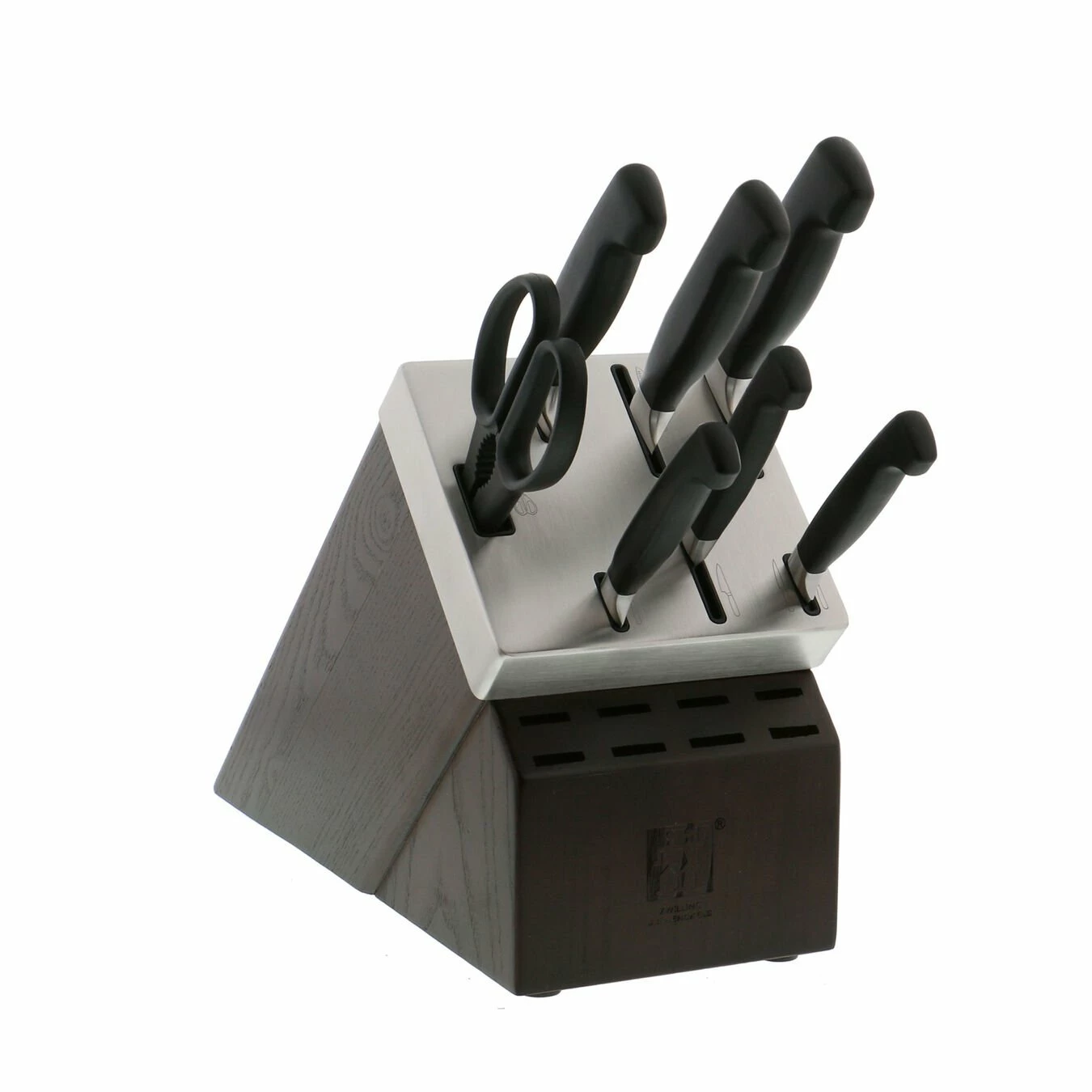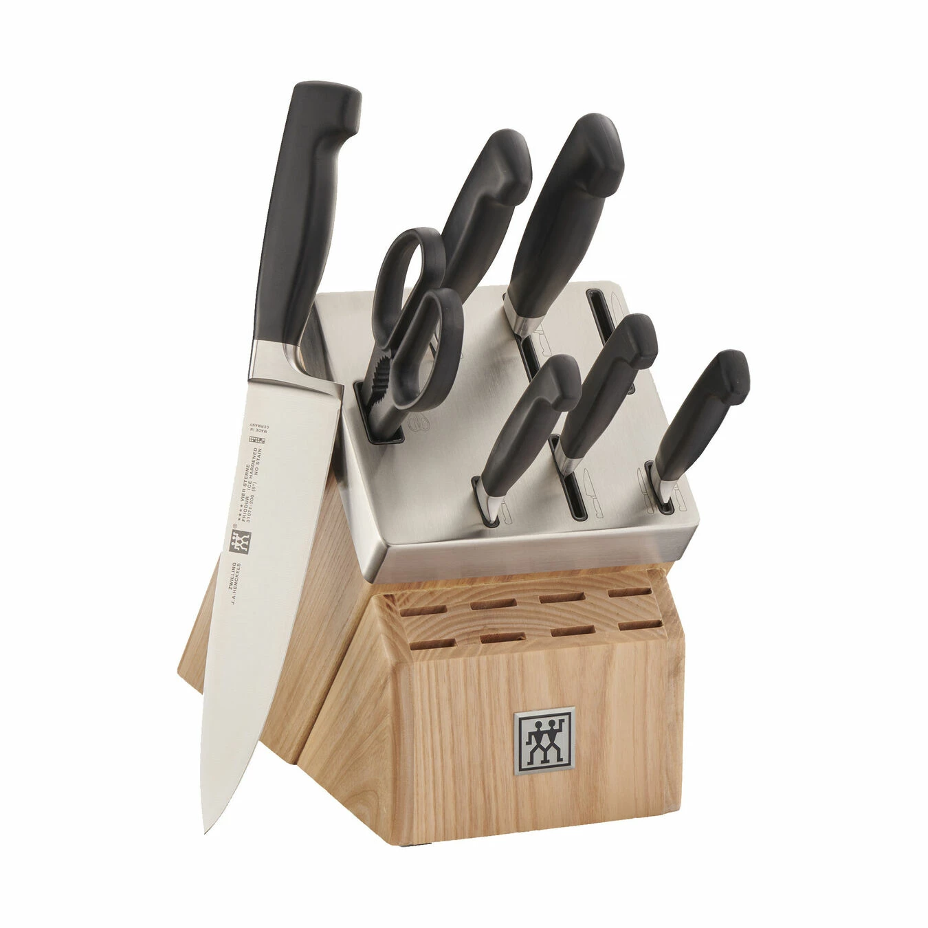 As the modern kitchen specialist, ZWILLING J.A. Henckels makes premium products that enhance the lives of professional and home chefs worldwide. We have put 287 years of cutlery expertise into our new cutting-edge knife block.Sharpness is always in reach with the FOUR STAR Self-Sharpening Knife Block. Its self-sharpening slots boast build-in honing mechanisms that automatically sharpen to the perfect angle each time a knife is removed or replaced.This technology ensures your most essential knives are always sharp, for effortless, quick, and precise prep work. The block’s handsome wood grain and sophisticated stainless steel add aesthetic appeal to your countertop.Tailor-made for FOUR STAR knives, this innovative brilliant knife block helps you maintain the superior sharpness of their ice-hardened blades. Precision-forged from a single piece of special formula stainless steel, these top-selling knives offer exceptional balance for safe, fatigue-free cutting.4″ Paring Knife; 5″ Serrated Utility Knife; 5.5″ Fine Edge Paring Knife; 8″ Bread Knife; 8″ Chef’s Knife; 7″ Hollow Edge Santoku Knife; TWIN Shears; 15-slot Self-Sharpening Block
