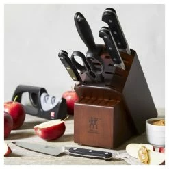 - Set includes: 4-inch paring, 5.5-inch prep, 8-inch chefβs knife, 8-inch bread knife, kitchen shears, 9-inch honing steel, 2-stage knife sharpener, and 16-slot hardwood knife block