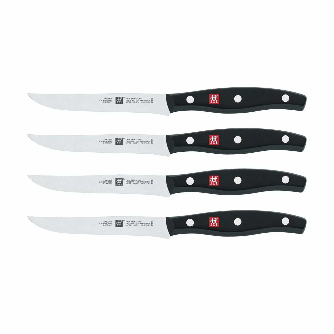 The Twin Signature 4-piece steak knives are designed for effortlessly slicing through meat. This set includes four, 4.5-inch steak knives designed for cleanly slicing through pork chops, filet mignon, and chicken cutlets with ease, without tearing or shredding.